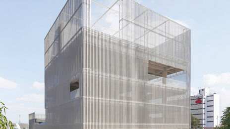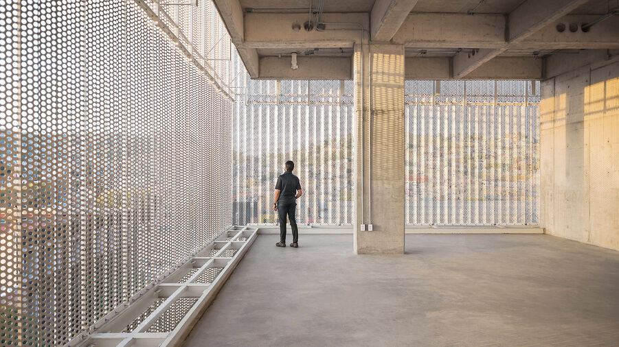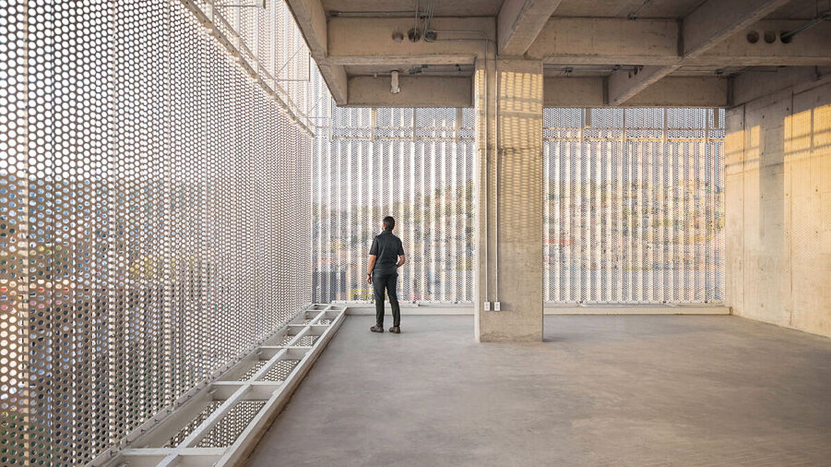 Der Neubau des Architekturbüros FRPO im mexikanischen Toluca vereint sehr unterschiedliche Nutzungen hinter seiner perforierten Metallhülle. Neben Parkplätzen, Laden- und Büroflächen ist auch ein öffentlich zugänglicher Dachgarten auf dem siebengeschossigen Kopfbau entstanden.