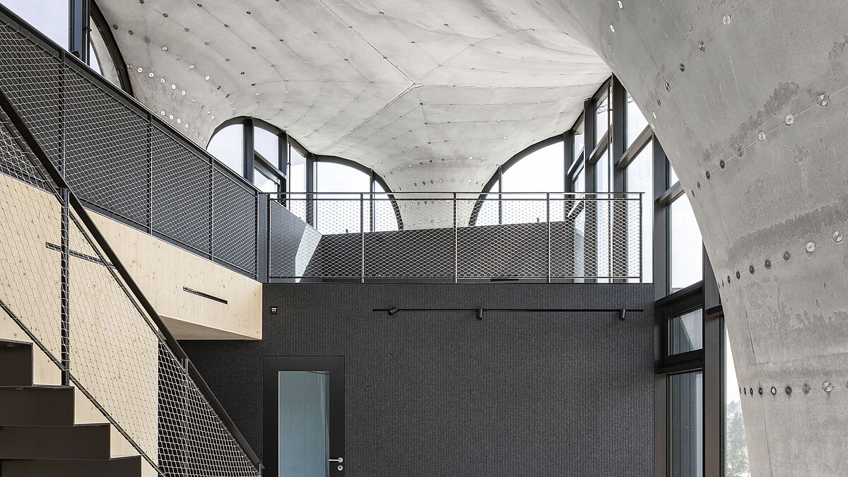 Mit von der Partie an diesem nicht alltäglichen Bauwerk war auch die Pletscher Metallbau AG, Schleitheim. «Wir wurden bereits sehr früh in die Entwicklungsprozesse dieses nicht alltäglichen Bauvorhabens eingeweiht und durften verschiedenste Stahl- und Metallbauarbeiten ausführen», sagt Reto Wetter, Inhaber und Geschäftsführer der Pletscher Metallbau AG, und fährt fort: «Neben den Unterkonstruktionen für das Betondach der anspruchsvollen, auskragenden Treppe, verschiedenen Geländern und der Terrassenkonstruktion sollen insbesondere die Glasfassaden, die an das gewölbte Betondach anschliessen, sowie die geschwungenen Einlagen aus Edelstahl erwähnt sein.»