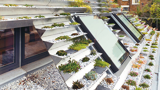 Das Dach ist ein aufgehängter Garten, der sich in kleinen Terrassen aufbaut. Rinnen aus abgekantetem und geschweisstem Edelstahlblech wurden über einer GRP-Membrane am Dach angebracht und bepflanzt. Insgesamt wurden über 800 verschiedene Pflanzen eingesetzt. Sie imitieren die Flora in Dungeness, der Heimatregion der Eigentümer. Der Garten ist begehbar und optisch ein sensationeller Hingucker für die Umgebung.