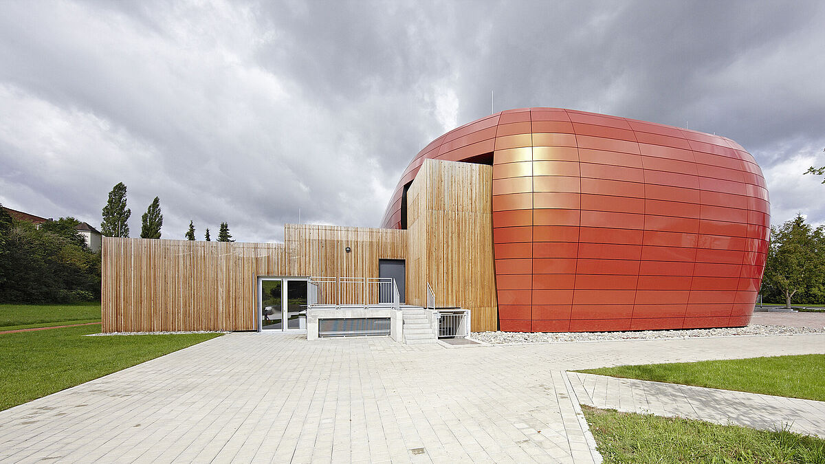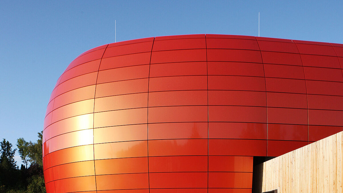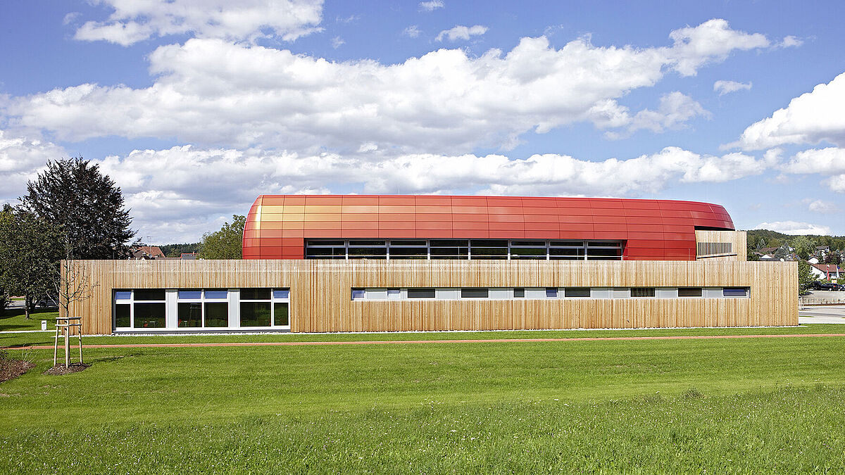 Der Sockel der Halle mit Eingangsbereich und Nebenräumen bildet einen Quader. Er knüpft mit warmgelber Holzfassade an die gelb- und rosafarbenen Putzfassaden der Nachbarschaft an. Der gradlinige, matt verwitternde Holzquader ist zudem typisch für die ländliche Architektur rund um den Bodensee bis in den Alpenraum. Darüber wölbt sich das Dach der Mehrzweckhalle bis auf Erdniveau. Es ist mit Alucobond-spectra- Cupral-Kassetten belegt, die je nach Tageslicht in verschiedenen Orangetönen changieren und die Besonderheit des Gebäudes betonen. In Sockel und Dach vereinen sich zwei gegensätzliche, aber zeitgenössische Architekturansätze: hier die auf regionalem, traditionellem Handwerk bauende Holz-Beton-Architektur, dort die gebogene Alucobond-Fassade, die in einem hochtechnisierten Produktionsverfahren entstand. Die Unterkonstruktion und jedes Fassadenelement wurden individuell mit einer Software berechnet und per CNC-gesteuerte Maschinen zugeschnitten und gebogen. Tradition und Hightech gehen hier Hand in Hand. ■