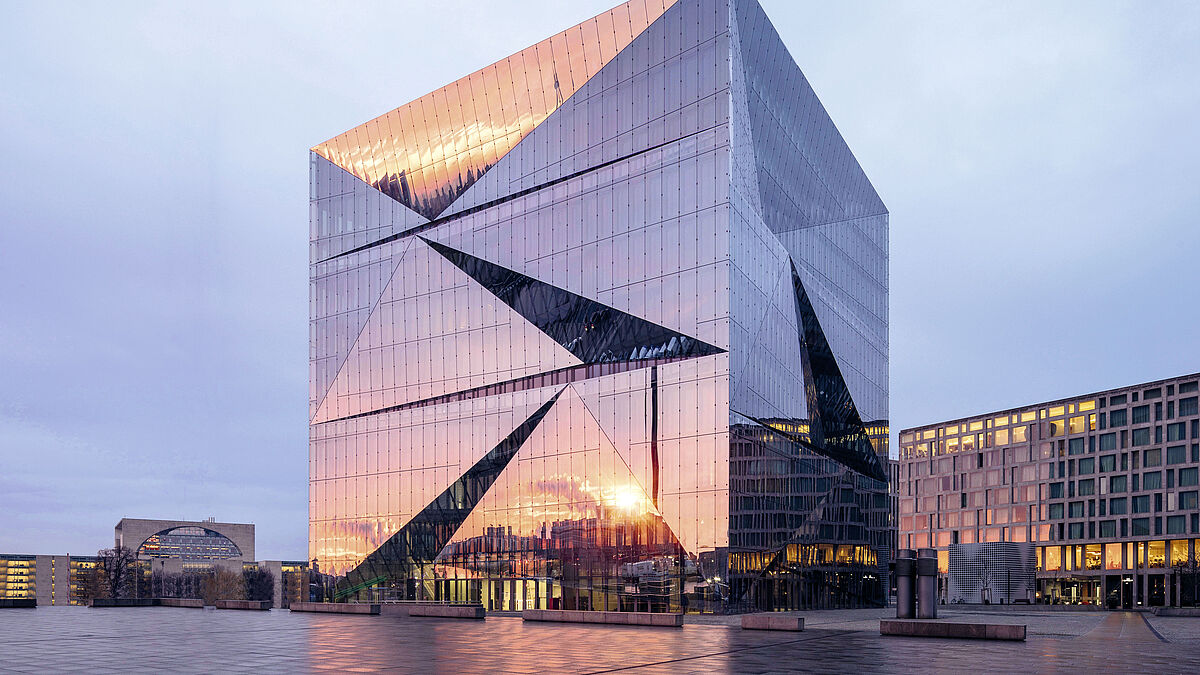 Mit seiner skulpturalen Fassade ist das Cube Berlin ein echter Hingucker. Die prismenförmigen Glasflächen spiegeln die Umgebung und lassen das Gebäude ständig anders aussehen, je nach Blickwinkel, Wetter und Tageszeit. Hinter den vollverglasten Faltungen verbergen sich von aussen nicht einsehbare Balkone und Ausgucke für die Mieter.