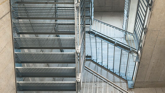 Treppenanlagen sollen direkte Wege, Zugänge aber auch Fluchtmöglichkeiten bieten. Bei einem Firmengelände mit zwei Betontürmen wurden zur Gewährleistung des Fluchtwegs die beiden Betontürme mit Innentreppen erschlossen.