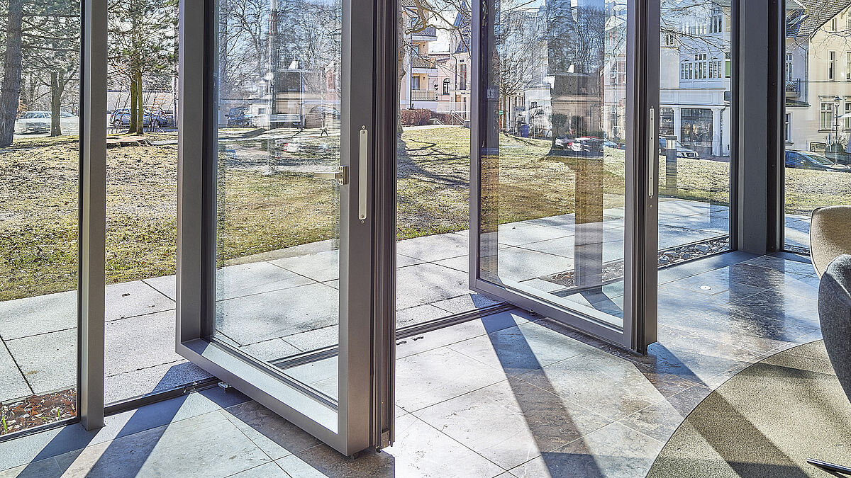 Die VISS Fassadentüren entsprachen dem Wunsch der Architekten nach raumhohen und rasterfeldgrossen Öffnungselementen, die die Pfosten-Riegel-Fassade beleben. Grundsätzlich sind Türhöhen bis zu sechs Meter möglich; da die maximalen Türflügelgrössen und Türflügelgewichte aber von verschiedenen Faktoren beeinflusst werden, ist stets eine individuelle Konfiguration erforderlich. Für den verglasten Anbau des Tourismus-Service-Zentrums in Heringsdorf wurden sie «nur» knapp drei Meter hoch gefertigt, korrespondierend zur Raumhöhe des Besucherpavillons. VISS Fassadentüren öffnen grundsätzlich nach innen; wegen des versetzten Anschlags ist die Öffnung jedoch auch von aussen deutlich wahrnehmbar: Je nach Öffnungsgrad ragen die Türflügel mal mehr, mal weniger über die Fassadenebene hinaus.