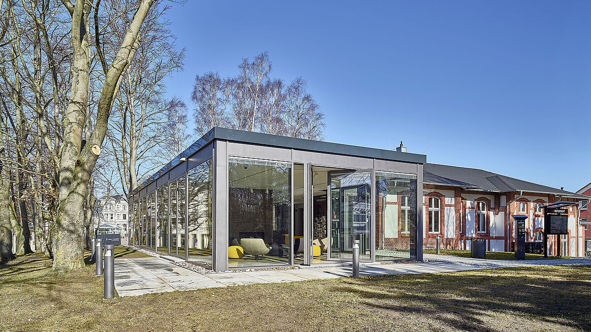 Das sogenannte Lange Haus, zwischen 1874 und 1884 als Verwaltungssitz der Aktiengesellschaft Seebad Heringsdorf errichtet und zuletzt als Bibliothek genutzt, zählt zu den ortsbildprägenden Baudenkmalen des traditionsreichen Seebads auf der Insel Usedom. Über die Jahrzehnte hinweg blieb es weitgehend in seiner ursprünglichen Gestalt erhalten. Ein nachträglich an der Südfassade hinzugefügter Anbau wurde im Rahmen der jüngsten Sanierung abgerissen und durch einen modernen Pavillon aus Stahl und Glas ersetzt. Mit seiner grosszügigen Verglasung signalisiert er Transparenz und Offenheit – aber «offen» ist der Pavillon nicht nur im übertragenen Sinn: Insgesamt acht raumhohe, zweiflügelige Wendetüren mit versetztem Drehlager kennzeichnen diese ganze besondere Fassadenkonstruktion im innovativen Stahlleichtbau.