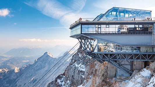 Im Sommer 2018 wurde der Umbau der Bergstation der neuen Bayerischen Seilbahn Zugspitze mit der Eröffnung des Gipfelrestaurants Panorama 2962 abgeschlossen. Das nach Plänen von Hasenauer.Architekten erweiterte Gebäude auf Deutschlands höchstem Berg erlaubt dank grosszügiger Verglasung spektakuläre Panoramablicke. Für Sicherheit in der Bergstation sorgen Brandschutzgläser von Vetrotech Saint-Gobain, welche bei der Herstellung, Lieferung und dem Einbau allen Beteiligten Enormes abverlangten.
