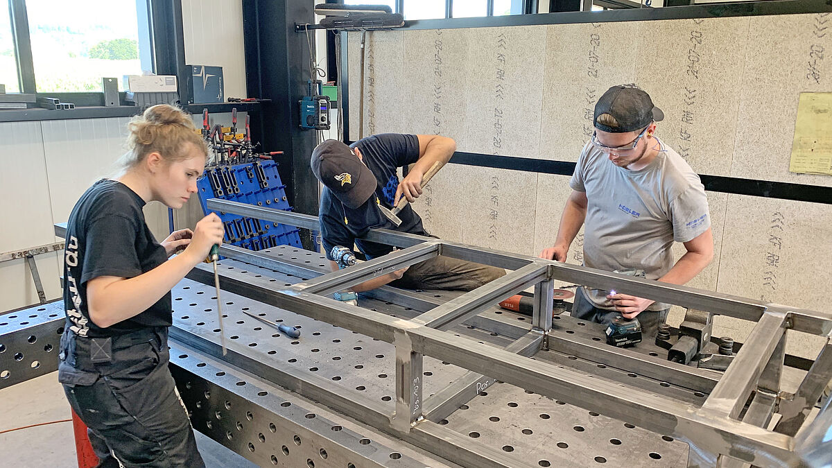 Die Werkstattgruppe fing an, das Material zuzuschneiden. Danach wurde alles entgratet und die nötigen Löcher gebohrt oder gestanzt. Jeder hatte eine spezifische Aufgabe gefasst und diese im Verlauf des Tages vollendet. Bei Fragen konnten wir uns jeweils an den Lernenden der Firma oder an die Lehrpersonen wenden.