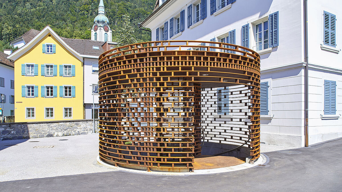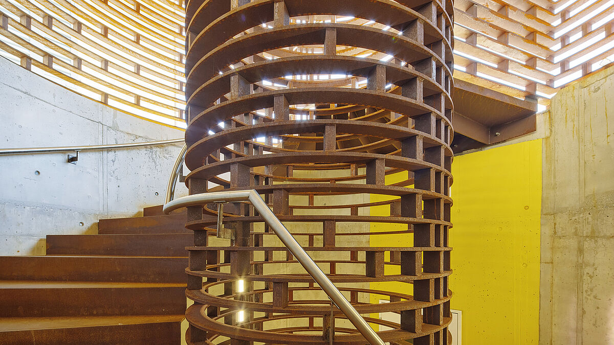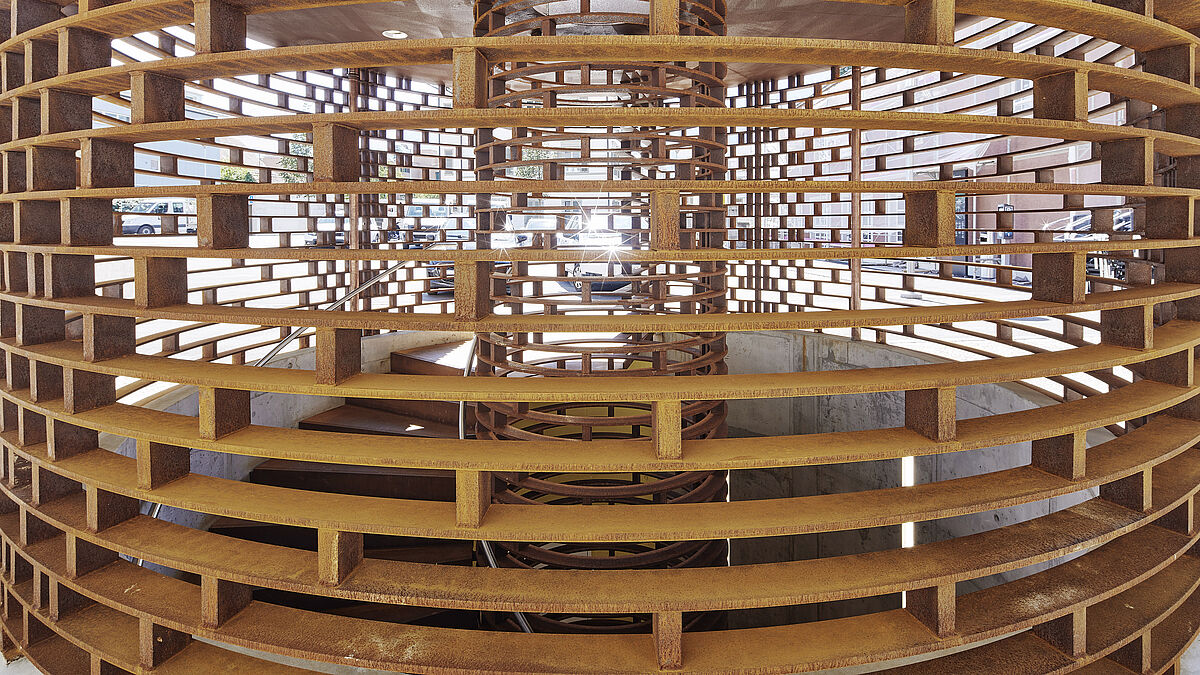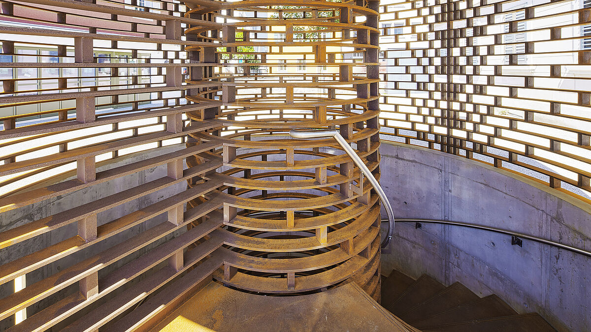 Die neue Tiefgarage unter dem Gemeindehausplatz in Altdorf soll dem Parkplatzmangel entgegenwirken und den Verkehr im Dorfzentrum beruhigen. Die Ruch Metallbau AG, Altdorf, erhielt den Auftrag zugesprochen, die zur Tiefgarage gehörende Spindeltreppe aus Cortenstahl zu liefern. Der korrodierte Cortenstahl verleiht der Treppe einen industriellen Charakter, was einen visuellen Spannungsbogen zu den altehrwürdigen Bauten bildet. Bei näherer Betrachtung des komplexen Werks fällt auf, dass der runde Mantel und auch die Spindel aus reifenförmigen Stahlblechen und einer Riesenmenge Stahlklötzen zusammengesetzt sind und somit wie ein transparentes und doch markantes Kunstwerk wirken. Wer genau hinschaut, stellt fest, dass eine rhythmische Reihenfolge der Stahlklötze nur im Bereich der obersten Reifen auszumachen ist. Alle anderen Klötze sind individuell, ohne erkennbare Abfolge platziert.