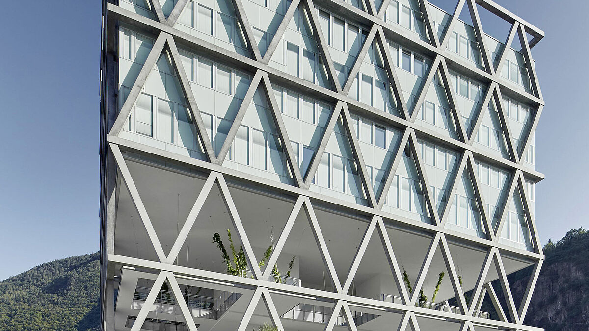 Voraussetzung für das stützenfreie und damit äusserst flexible Open-Office-Konzept ist die V-förmige, massive Fassadenstruktur, die in Kombination mit den zentralen technischen Erschliessungstürmen das Tragwerk bildet. Der Hybrid aus Stahlbeton und eingegossener Stahlkonstruktion trägt an den Knotenpunkten das gesamte Gebäude. Mit diesem speziellen Fassadenkonzept verfügen die Büros über grosse innenarchitektonische Flexibilität und eine Tageslichtausleuchtung mit einem Faktor von über 2.