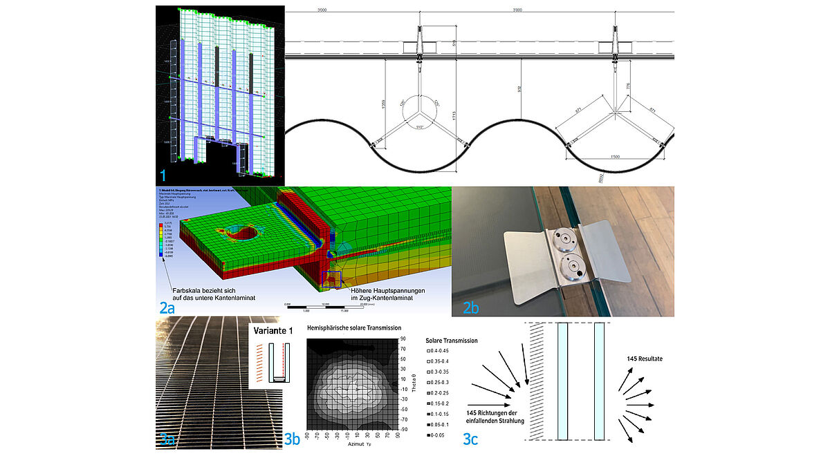 Auch in den Bachelor-Abschlussarbeiten werden regelmässig komplexe Themenstellungen aus der Praxis sowie der aktuellen Forschung und Entwicklung bearbeitet. Beispiele dafür sind Anwendungsszenarien des neuen SIA-Merkblatts zur Glasbemessung SIA 2057, die Untersuchung von dünnen, in Verbundglas einlaminierten strukturellen Glasverbindern (Abb. 2) oder die Beurteilung von selektiven Sonnenschutzsystemen (Abb. 3).