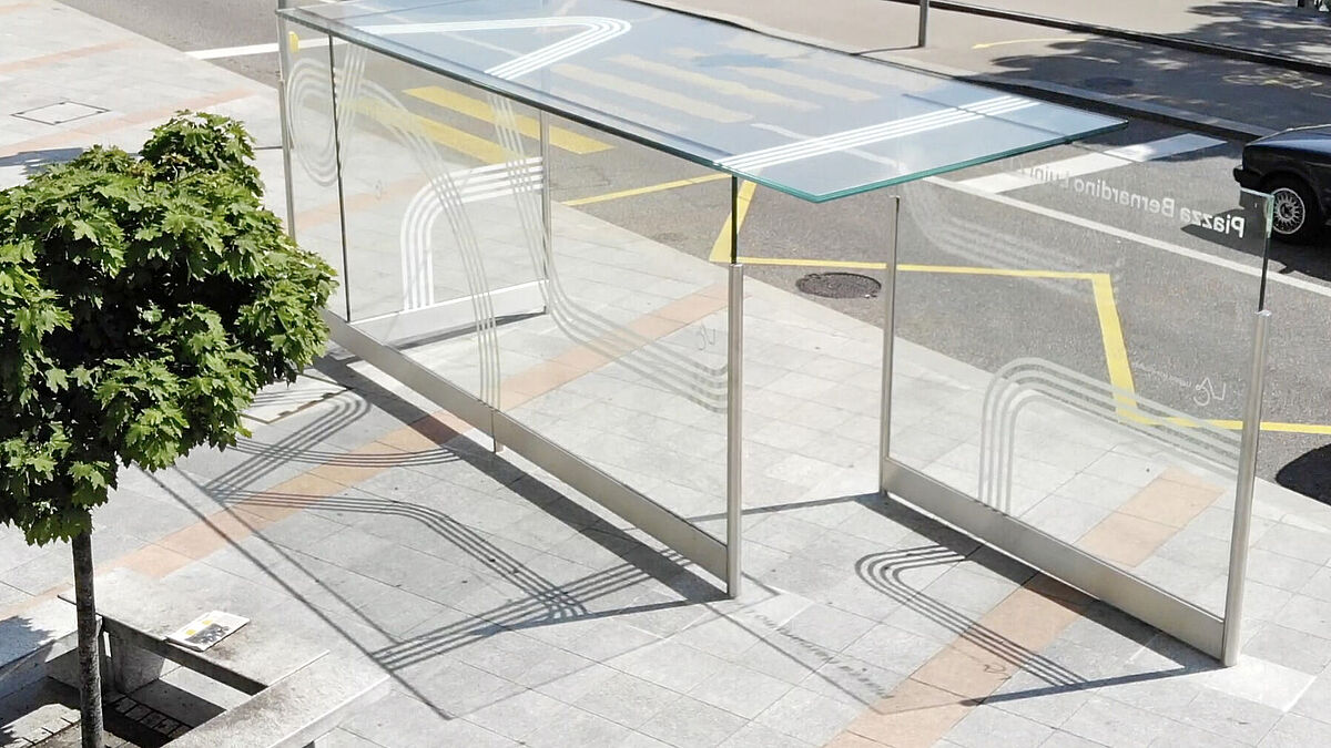 Stahl und Glas sind die unumstrittenen Protagonisten dieses modernen Stadtmobiliar-Entwurfs, der ihre Besonderheiten perfekt zur Geltung bringt. Sie beeinträchtigen in keiner Weise die sinnliche Wahrnehmung des Raums und machen diesen Wartebereich auch heller und harmonischer.
