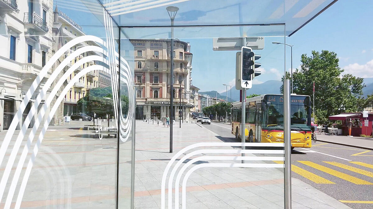 Die neue Haltestelle aus Stahl und Glas steht auf der Piazza Luini in Lugano und gehört zu den Neuerungen in dem Teil der Stadt, wo sich das berühmte Kulturzentrum LAC befindet. Mit filigraner Leichtigkeit passt sich die Konstruktion der Wertigkeit ihrer Umgebung an, die heute als charakteristisches Merkmal der ganzen Gegend anzusehen ist.