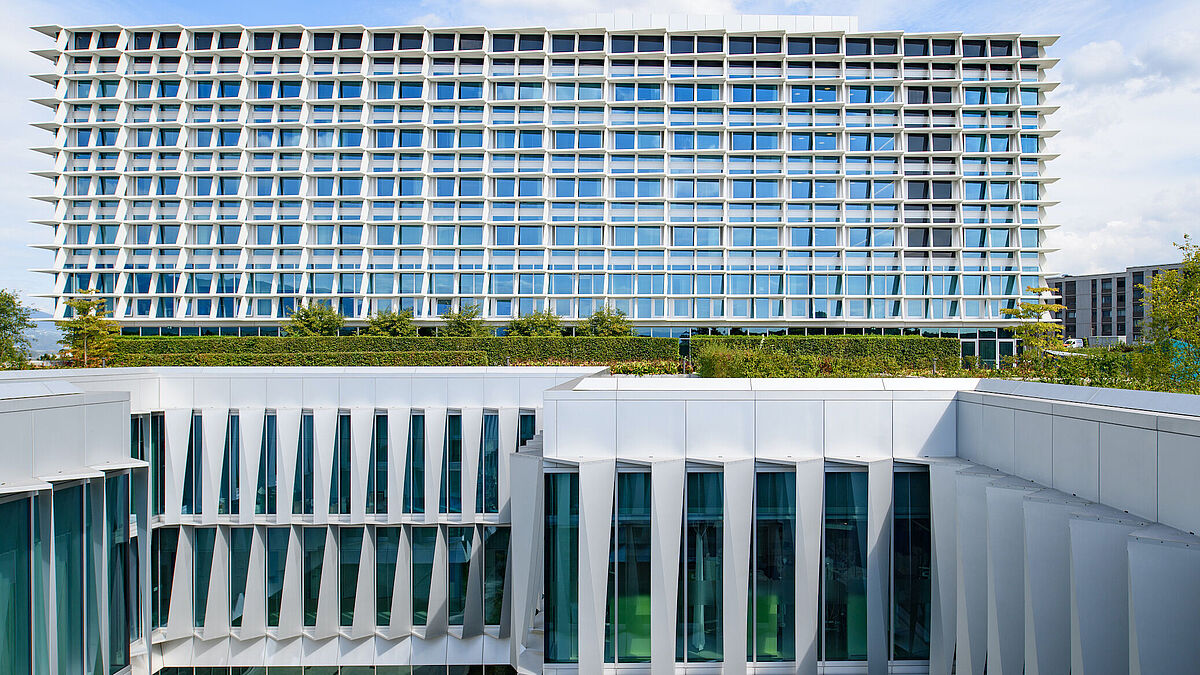 Das Bettenhaus markiert den Schnittpunkt der beiden Schenkel der L-Form. Die Fassade zeigt hier ein feingliedrigeres Erscheinungsbild. Prägend wirkt vor allem das vorgehängte Verschattungssystem, das aus 1740 skulpturalen Elementen aus Weissbeton besteht. Die eigentliche Fassade dahinter besteht aus einer raumhohen Vollverglasung. Auch hier wurde ein Dreifachisolierglas von Glas Trösch ausgewählt, jedoch mit anderer Funktionalität als beim Sockelbau: Zum Einsatz kam Silverstar Combi Neutral 51/26, das einen Grund-Hitzeschutz mit sehr guter Wärmedämmung kombiniert. Letztere wird durch eine zusätzliche Beschichtung nochmals verbessert und erreicht so einen äusserst niedrigen Ug-Wert von 0,51 W/m²K bei beachtlichen 44,5 Prozent Lichttransmission. In der Summe gewährleistet dies optimale Bedingungen für die schnelle Genesung der Patienten, die durch die hohe Farbneutralität des Glases besonders gute Ausblicke geniessen.