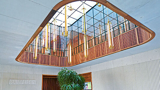Der regelmässige Raster der Vertikalverglasung liess das quadratische Muster an der Decke entstehen. Zur Stabilisation und genauen Ausrichtung des Oberlichts ist die Stahlkonstruktion an 14 Stellen mit örtlichen Aufhängungen versehen. Da die Deckenverglasung von oben nicht zugänglich ist, waren auch keine weiteren sicherheitstechnischen Anforderungen zu erfüllen.