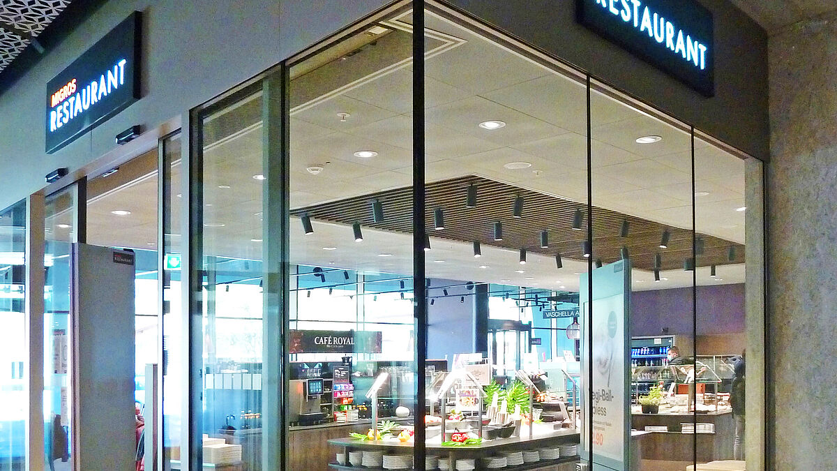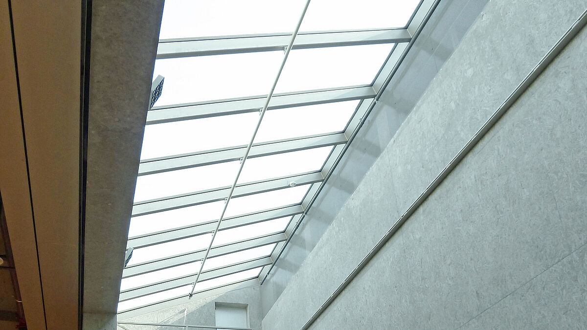 Das langgezogene Dach über der Rolltreppe schafft eine optische Verbindung nach aussen und durchflutet die Erschliessungszone mit Tageslicht. Die Tragkonstruktion besteht aus Rechteckstahlrohren und wurde im Werk der Metallbau Pfister AG zu einzelnen, rund 800 kg schweren Elementen verschweisst. Die Anlieferung an den Zielort erfolgte aufgrund der Nähe zum Flugplatz (300 m) mit dem Helikopter. So – erklärt Curdin Pfister – konnte dieser Prozess schnell und effizient erledigt werden.