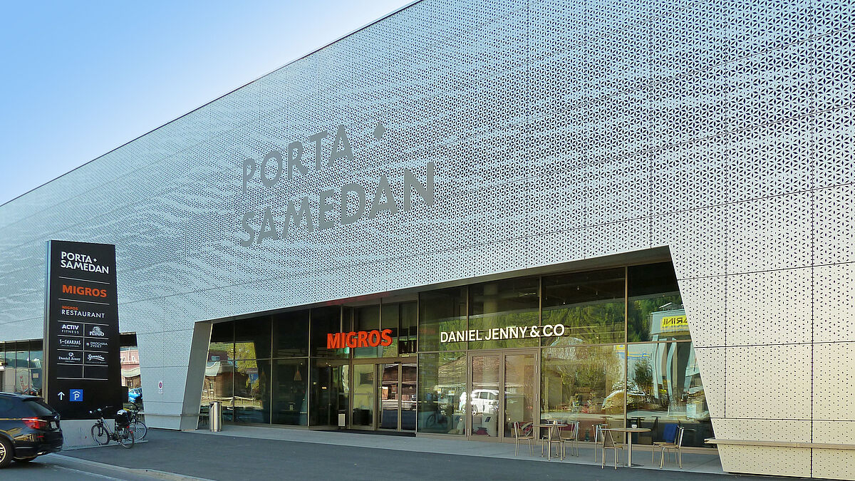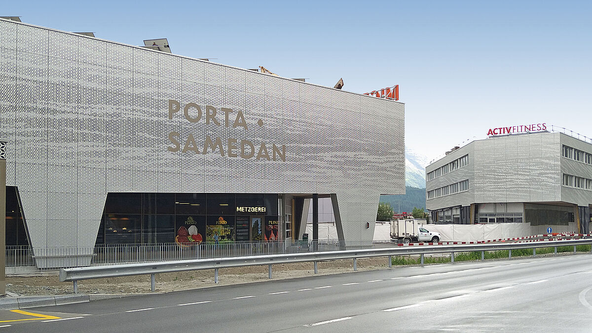 Die Bündner Ortschaft Samedan wurde um ein zentrales und grosszügig gestaltetes Einkaufszentrum bereichert. Das markante Gebäude mit seiner silbern schimmernden Metallfassade bietet den Anwohnern aus der näheren und ferneren Umgebung attraktive Einkaufsmöglichkeiten. Metall und Glas spielen beim Bau eine zentrale Rolle.