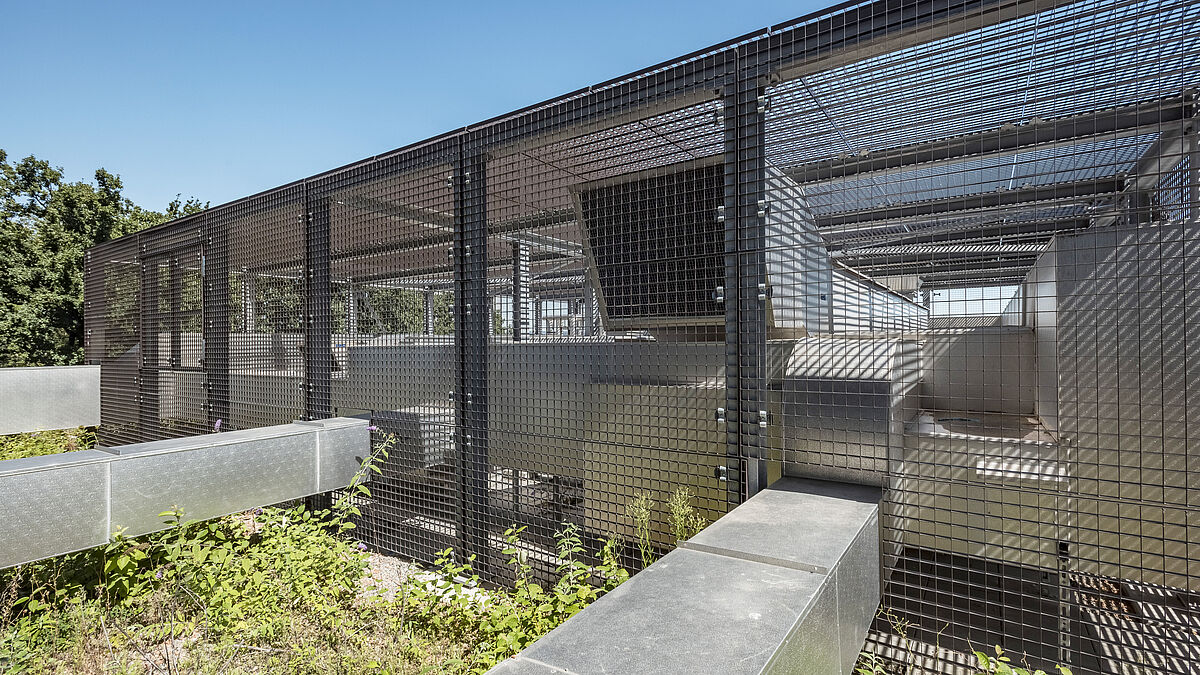 Les caillebotis pressés présentent une largeur de maillage de 55 x 55 mm et bénéficient d’une enduction duplex. Cela signifie que dans un premier temps, les caillebotis ont été galvanisés à chaud afin de garantir la longévité, avant d’être, dans un second temps, revêtus par poudre. Ici, le choix s’est porté sur la teinte RAL 8019 afin que les grilles caillebotis s’adaptent à l’environnement (comme par exemple la façade). Certains caillebotis pressés ont été évidés pour que des conduites puissent traverser les abris sans obstacle.