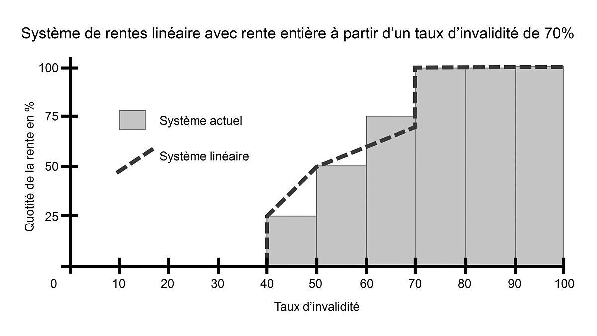 Dans le système de rentes actuel à quatre niveaux, pour de nombreux bénéficiaires de rentes AI, il n'est pas intéressant de travailler plus. En effet, si la somme de leur rente et du salaire qu’ils réalisent est supérieure au revenu d’invalide calculé et cela entraîne le dépassement d’une des quatre valeurs seuil, la rente est réduite en conséquence. L’introduction d’un système linéaire est censée changer ceci : Toute personne qui travaille en plus de sa rente AI doit avoir à la fin du mois un revenu supérieur à celui qu’elle aurait sans activité lucrative supplémentaire.