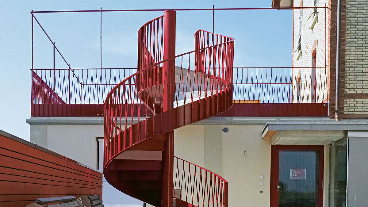 Installés sur le parvis d’une école privée à Winterthour, l’escalier rouge et sa passerelle desservent la terrasse de toit plat qui constitue le coin d’une salle de classe depuis l’espace de pause. Le colimaçon de l’escalier de 3,70 m de haut est implanté au niveau du plafond de la salle de chant. Il est évident que les salles de classe et de chant ne doivent pas être perturbées par le bruit occasionné par les personnes qui empruntent l’escalier. Les concepteurs ont donc décidé de découpler acoustiquement l’escalier et sa passerelle du bâtiment afin de réduire autant que possible la transmission de bruit provenant de la structure. C’est l’entreprise O. Hadorn AG, à Winterthour, qui a été chargée de la conception, de l’exécution et du montage.