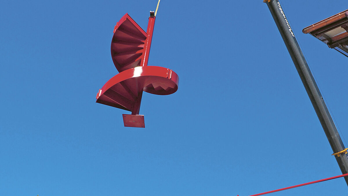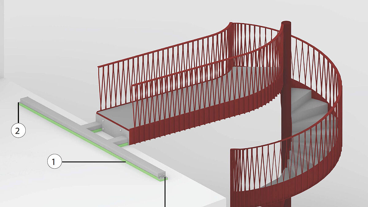 La construction de l’escalier et de la passerelle livrée en deux parties est vissée de telle sorte qu’elle soit intrinsèquement rigide en flexion. Pour poser la passerelle sur le bâtiment tout en évitant les oscillations latérales de l’escalier en colimaçon, une fixation stable et acoustiquement découplée a été nécessaire au niveau du plancher de la terrasse.