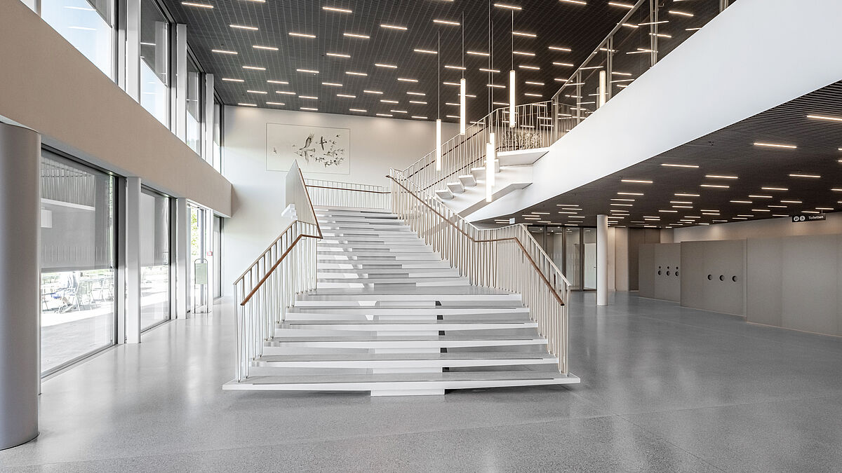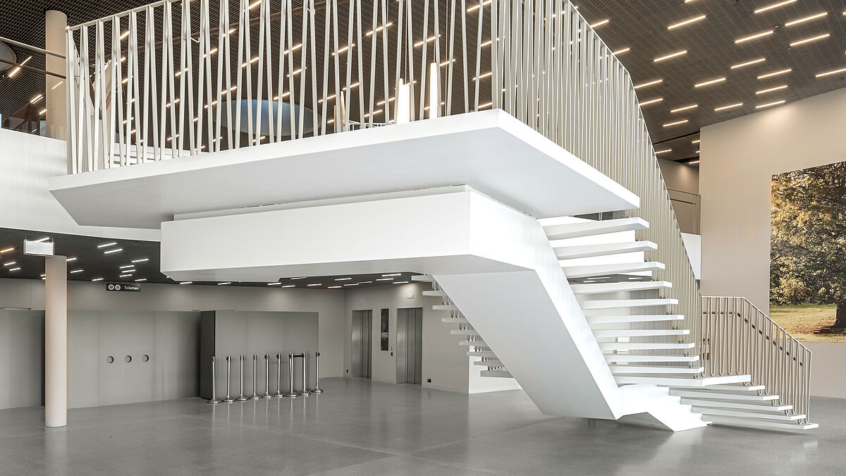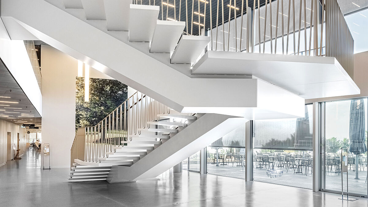 Dès qu’il entre dans le hall d’entrée des pavillons d’hospitalisation de la clinique Barmelweid, le visiteur se sent accueilli par l’escalier qui s’ouvre vers la porte. L’escalier en acier blanc qui dessert l’énorme galerie qui surplombe le niveau d’entrée s’étend de manière continue du haut vers le bas, ce qui renforce son effet accueillant. Construit comme un escalier à longeron autoportant, ses couleurs claires le rendent visuellement très léger et transparent malgré sa largeur maximale remarquable de près de quatre mètres. Le maître d’ouvrage a confié la planification, la fabrication et le montage de cet ouvrage à l’entreprise de construction métallique Bafento AG de Gebenstorf.