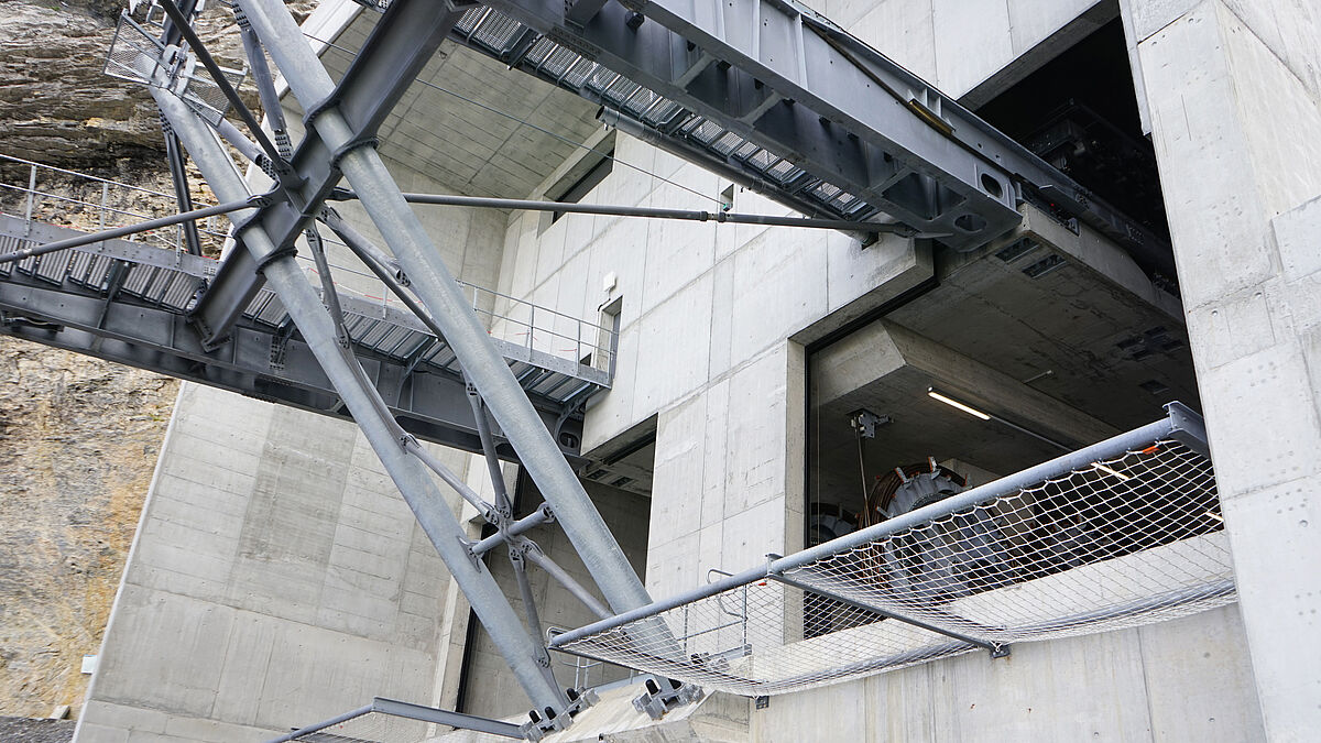 Le transport et le montage des énormes portes étaient aussi un défi à ne pas sous-estimer. Le transport vers le lieu de destination à l’aide d’un téléphérique provisoire a dû être effectué principalement de nuit en raison des courses d’essai déjà réalisées sur la ligne en journée. Pour permettre leur transport, chacune des grandes portes descendantes a été divisée en trois segments et assemblée sur place. L’habillage en tôles a été réalisé par la suite et a nécessité quelque 7500 rivets.