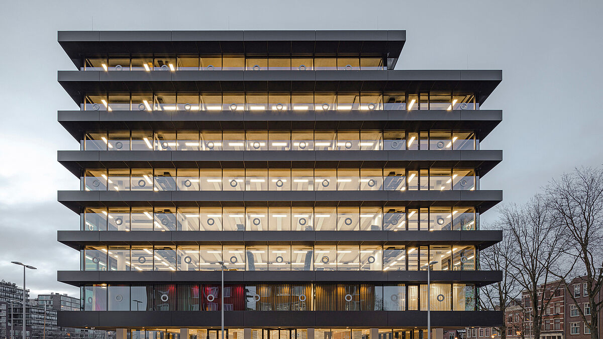 L’immeuble de bureaux « De Walvis » construit dans le style rationaliste dans les années 1960 se situe sur l’île de Bickerseiland, dans le nord du centre-ville historique d’Amsterdam. Il porte le nom d’un ancien quai de l’île du port. Walvis signifie baleine en néerlandais. KAAN Architecten a transformé le bâtiment vieillissant en immeuble moderne dédié aux branches de la publicité, des médias et des technologies pour lequel le maître d’ouvrage, Maarsen Groep, a voulu une apparence « cool et industrielle ». La façade vitrée raffinée symbolise les éléments de conception que sont la clarté, la légèreté et l’élégance.