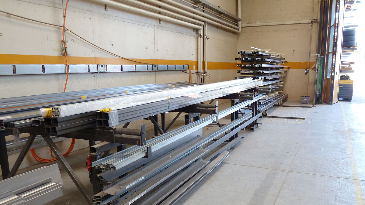 Les éléments de cadre finis quittent ensuite la partie production munis des documents nécessaires pour être déposés sur des chariots spécialement conçus en vue du traitement de surface extérieur. L’enlèvement du cadre brut et sa restitution après le laquage sont effectués de manière autonome par le transporteur de l’usine de laquage.