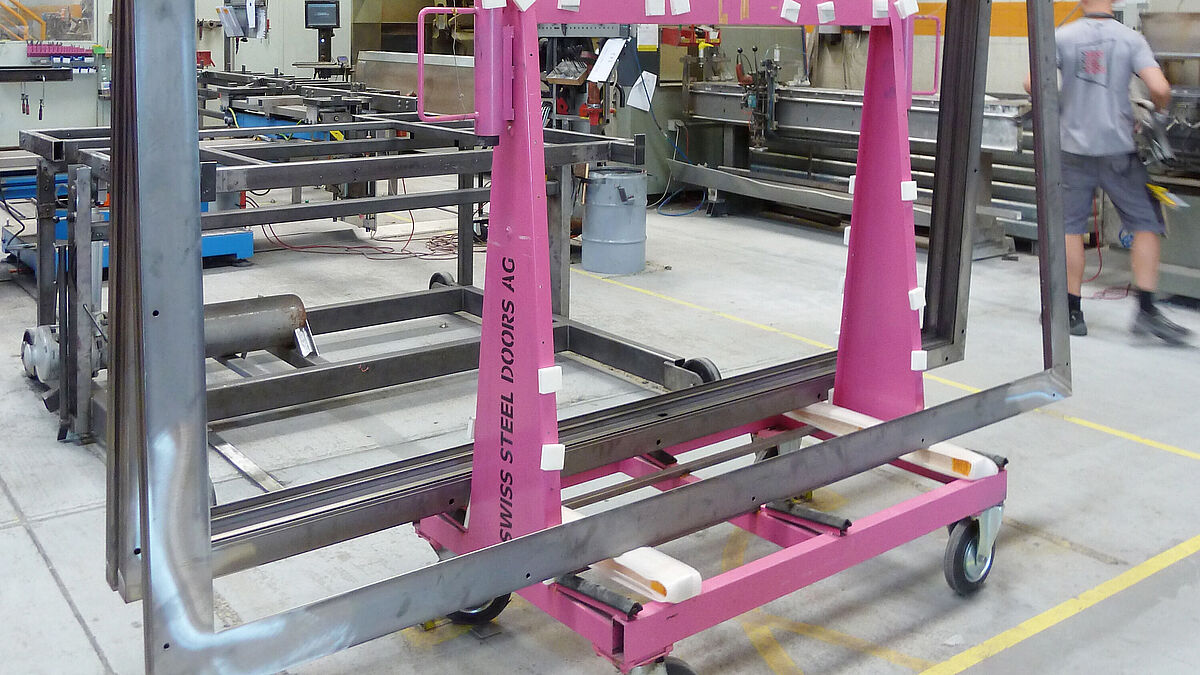 L’empilage et le transport des éléments de porte jouent aussi un rôle central dans le processus. Pour cela, Swiss Steel Doors AG a construit des supports mobiles spéciaux adaptés aux besoins et qui font l’objet d’améliorations continues. À première vue, ils semblent à peine différents des produits disponibles dans le commerce. La teinte « rose » utilisée les rend bien visibles, permet un bon aperçu et limite les dangers potentiels. De plus, les chariots présentent des spécificités par rapport aux produits disponibles dans le commerce. À titre d’exemple, ils sont réglables en hauteur, traversables (sans planches horizontales) et les pattes de crochets de grue sont disposées transversalement pour faciliter l’introduction du crochet de grue entre deux cadres hauts.