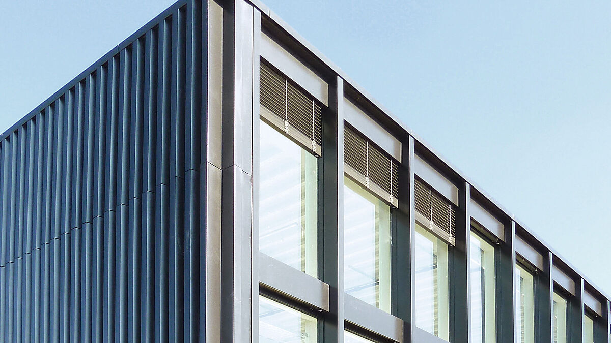 Les deux façades courtes des côtés est et ouest sont constituées de panneaux thermiquement disjoints avec des tôles profilées extérieures. Les tôles profilées verticales en forme de V se retrouvent également sur la façade sud, au niveau de la bordure du toit, et sur la façade nord, au-dessus de l’étage.