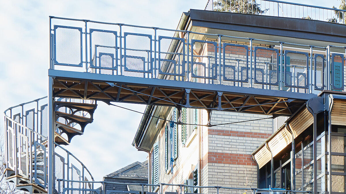 La passerelle reliant le toit-terrasse et l’escalier affiche une grande légèreté esthétique. Une mince structure au sol avec barre soudée en diagonale forme avec les deux supports en acier la structure porteuse primaire. Un ensemble raidisseur complémentaire avec renforts et barres en acier transforme le plancher léger en ensemble porteur stable. ■