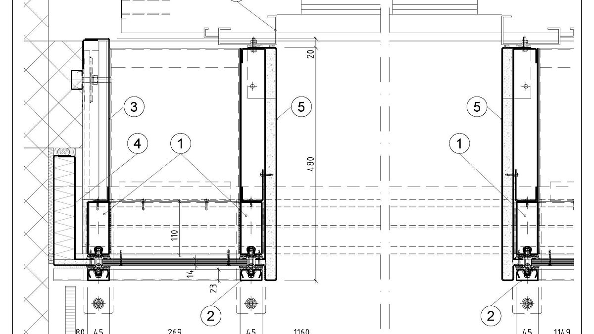 Le vitrage d’ascenseur se divise en deux parties : la section en dessous des cinq pièces autour des portes de l’ascenseur et celle au-dessus des dix pièces comportant des vitres et des panneaux de remplissage. Fabriqué à partir d’une poutre IPE 160, le support porteur évoqué plus haut est installé directement au-dessus des portes pour reprendre les efforts dans la maçonnerie latérale et pour suspendre les portes de l’ascenseur. Il est évident que ce type de construction assorti d’extensions de profilés et d’habillages de supports E30 sort de l’ordinaire et qu’il a nécessité divers développements avant d’aboutir à ce système.