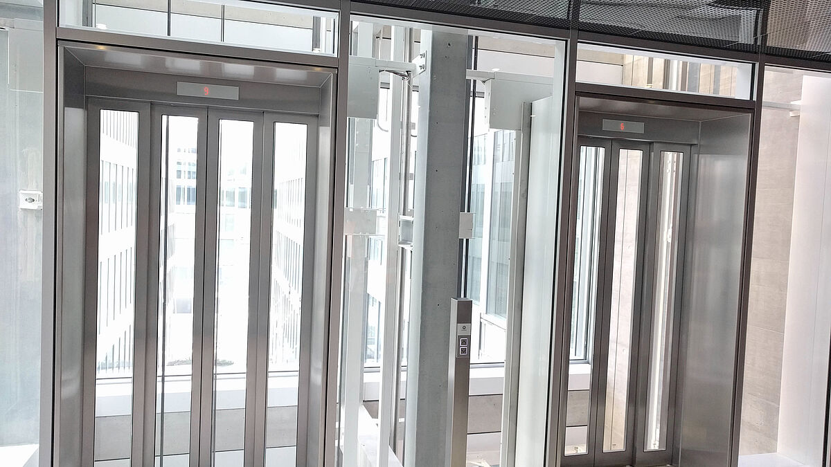 Le vitrage d’ascenseur H 12 de 4,8 m de large et de 6,5 m de haut est très transparent et raffiné avec ses baguettes de recouvrement filigranées dont la partie visible mesure à peine 45 mm de large. Sur ces vitrages d’ascenseur E30, il aurait été impossible d’utiliser plus de verre car les panneaux de raccordement périmétriques et les supports porteurs continus devaient satisfaire aux strictes exigences de la classe de protection incendie E30.